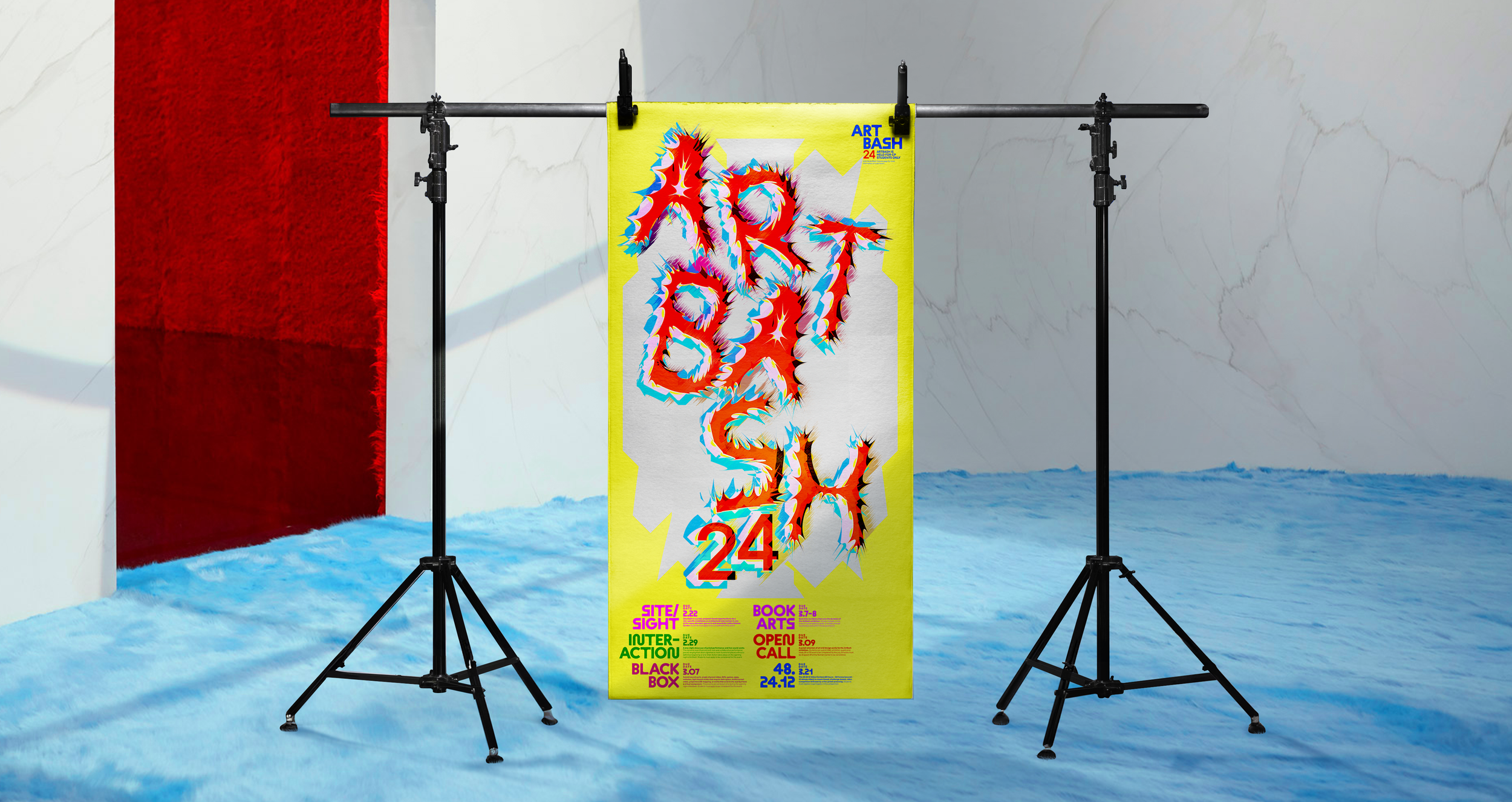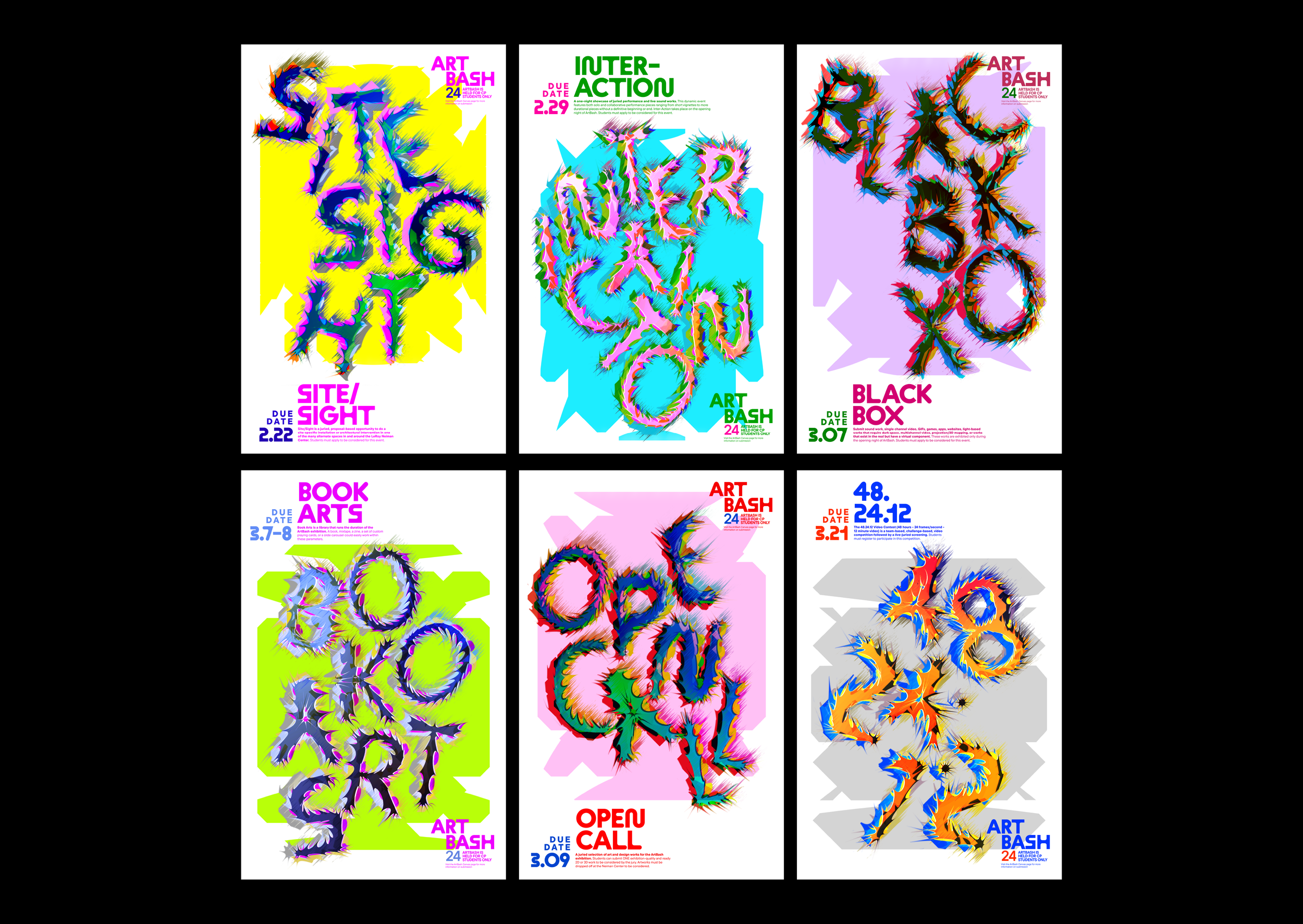 A bold visual identity for ArtBash, the annual first-year exhibition at the art college. Inspired by the spirit of experimentation that defines students’ journeys, the design breaks from traditional typographic rules: digitally altering and layering letterforms to mirror the endless explorations and overlapping practices of art school life. The result is an energetic, process-driven identity that captures the curiosity and creative momentum of the student community.